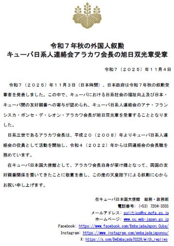 さらに表示する キューバ共和国におけるハリケーン・メリッサ被害に対する緊急援助 キューバ日系人慰霊祭の実施 ハリケーン・メリッサ被害に対する緊急援助 引き渡し式の実施 キューバ共和国におけるハリケーン・メリッサ被害に対する緊急援助 令和7年秋の外国人叙勲 キューバ日系人連絡会アラカワ会長の旭日双光章受章 日系人慰霊堂清掃・整備活動の実施 中村大使によるオマーラ・ポルトゥオンドさん誕生日会出席 令和7年度日本政府奨学金留学生・国際交流基金研修生 ・日系人会議参加者壮行会の開催 日本映画祭プレスカンファレンス 中村大使の出席 令和7年春の外国人叙勲授与式 オルランド・エルナンデス・ギジェン元駐日大使への 旭日重光章授与 第4回日本・キューバ官民合同会議の開催(2025.07.23) キューバ共和国に対する債務救済措置(2025.07.11) ハリケーン・ラファエル被害に対する緊急援助 アルテミサ県における引き渡し式(2024.12.06) ハリケーン・ラファエル被害に対する緊急援助 引き渡し式の実施(2024.11.25) 中村大使の信任状捧呈式(2024.11.20) 重要情報 キューバ訪問後に米国への渡航を予定されている方へ 現在、キューバへの渡航歴がある方の米国への入国には米国査証(ビザ)の取得が必要であり、ESTA(電子渡航認証システム)の提示だけでは十分ではありません。米国査証は、居住地にある米国大使館又は総領事館で申請する必要があります。また、キューバと米国への旅行が異なる時期に行われた場合でも、上記は適用されます。キューバ訪問後に米国への渡航を予定されている方は、こちらを参照し、「ヘルプトピックの検索」で「CUBA」を検索し、米国当局の指示を確認されると共に、米国大使館、米国総領事館、旅行会社、航空会社等で詳細を確認されることを推奨致します 令和7年[2025-07-01]キューバ入国時に必要な観光ビザの電子化について 令和5年[2023-12-19]キューバ入国時のD`VIAJEROSの入力及び提示の義務化について [2023-08-16]キューバ訪問後に米国への渡航を予定されている方へ キューバ滞在情報 新着情報 令和7年[2025-11-18]キューバ共和国におけるハリケーン・メリッサによる被害に対する緊急援助 令和7年[2025-11-09]キューバ日系人慰霊祭の実施 令和7年[2025-11-08]ハリケーン・メリッサ被害に対する緊急援助 引き渡し式の実施 令和7年[2025-11-05]キューバ共和国におけるハリケーン・メリッサによる被害に対する緊急援助 令和7年[2025-11-04]令和7年秋の外国人叙勲 キューバ日系人連絡会アラカワ会長の旭日双光章受章 令和7年[2025-11-01]日系人慰霊堂清掃・整備活動の実施 令和7年[2025-10-29]中村大使によるオマーラ・ポルトゥオンドさん誕生日会出席 令和7年[2025-09-30]令和7年版外交青書(英語全訳版及び仏・西語要約版の公開) 令和7年[2025-09-26]国慶節及び中秋節における動植物検疫の徹底について 令和7年[2025-08-29]令和7年度日本政府奨学金留学生・国際交流基金研修生・日系人会議参加者壮行会の開催 令和7年[2025-08-29]本邦に犬等を輸入しようとする場合の狂犬病抗体検査施設の一部変更について 令和7年[2025-08-06]日本映画祭プレスカンファレンス 中村大使の出席 令和7年[2025-07-30]令和7年春の外国人叙勲授与式 オルランド・エルナンデス・ギジェン元駐日大使への 旭日重光章授与 令和7年[2025-07-23]第4回日本・キューバ官民合同会議の開催 令和7年[2025-07-22]海外へ渡航される皆様へ 令和7年[2025-07-18]「草の根・人間の安全保障無償資金協力」外部委嘱員の募集 令和7年[2025-07-11]キューバ共和国に対する債務救済措置 令和7年[2025-06-27]キューバ入国時に必要な観光ビザの電子化について 令和7年[2025-05-30]ハリケーン・シーズンに際しての注意喚起(北米・中南米) 令和7年[2025-05-26]電子化した証明書(e-証明書)の発給開始について 令和7年[2025-05-08]違法薬物(大麻等)の密輸に関する注意喚起 令和7年[2025-05-08]国際ロマンス詐欺に関する注意喚起 令和7年[2025-04-30]ゴールデンウィークの海外渡航者に関する感染症予防について[海外へ渡航される皆様へ] 令和7年[2025-04-30]ゴールデンウィークの海外渡航者に関する感染症予防について[海外で健康に過ごすために] 令和7年[2025-04-30]大型連休中の海外における麻しん(はしか)に関する注意喚起 令和7年[2025-04-01]改正戸籍法の施行に伴う戸籍氏名へのフリガナ記載について すべてのニュースを読む... 新型コロナウィルス関連情報... 中村和人大使 中村和人大使挨拶 [100KB] 中村和人大使略歴 [48KB] SNS 閉じる おすすめ: 閉じる 日系人:日本と中南米の架け橋 中南米で活躍する日系人の方々 外務省:外交青書 天皇皇后両陛下-令和を迎えて- オンライン日本祭り特設ページ 国際交流基金運営サイト 「にほんご e ラーニング みなと」 国費留学生(スペイン語) 在留邦人の皆様へ 閉じる 竹島問題及び日本海呼称問題に関する状況提供について [74KB] 特別HP企画 閉じる 「キューバで日本」